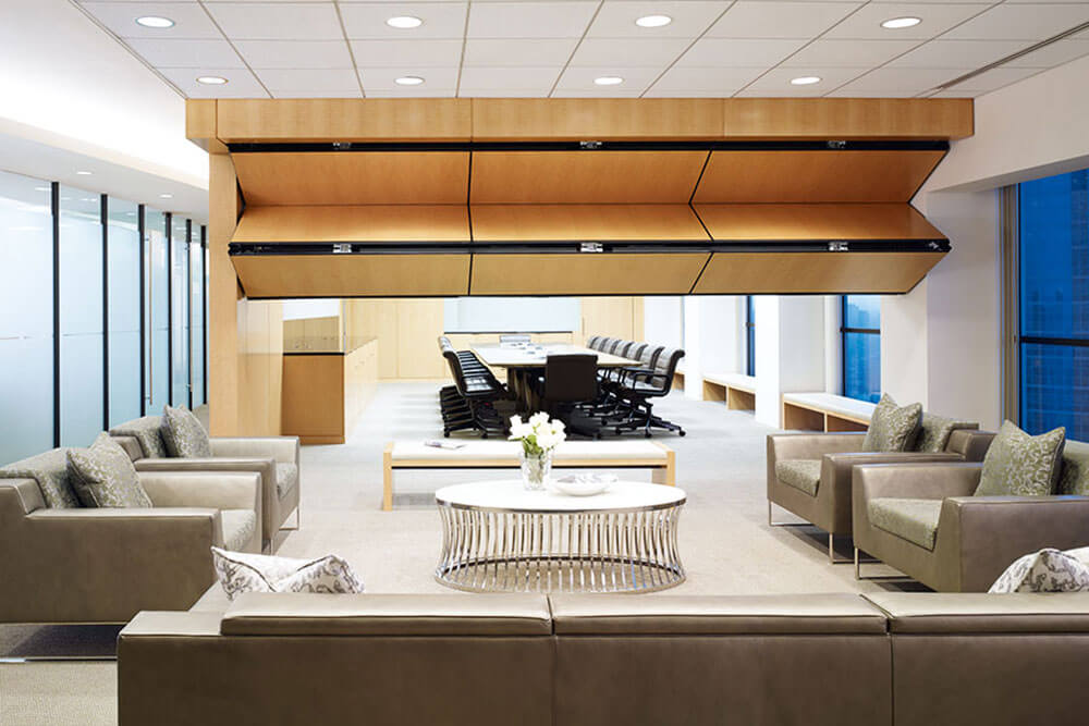 The space-saving vertical movable wall system retracts to the underside of the ceiling or into a specially provided ceiling cavity. When parked, the system merges harmoniously and almost invisibly with the ceiling. In addition to better use of space, the Skyfold also enhances facility appearance as no lateral guide or floor rails are required.